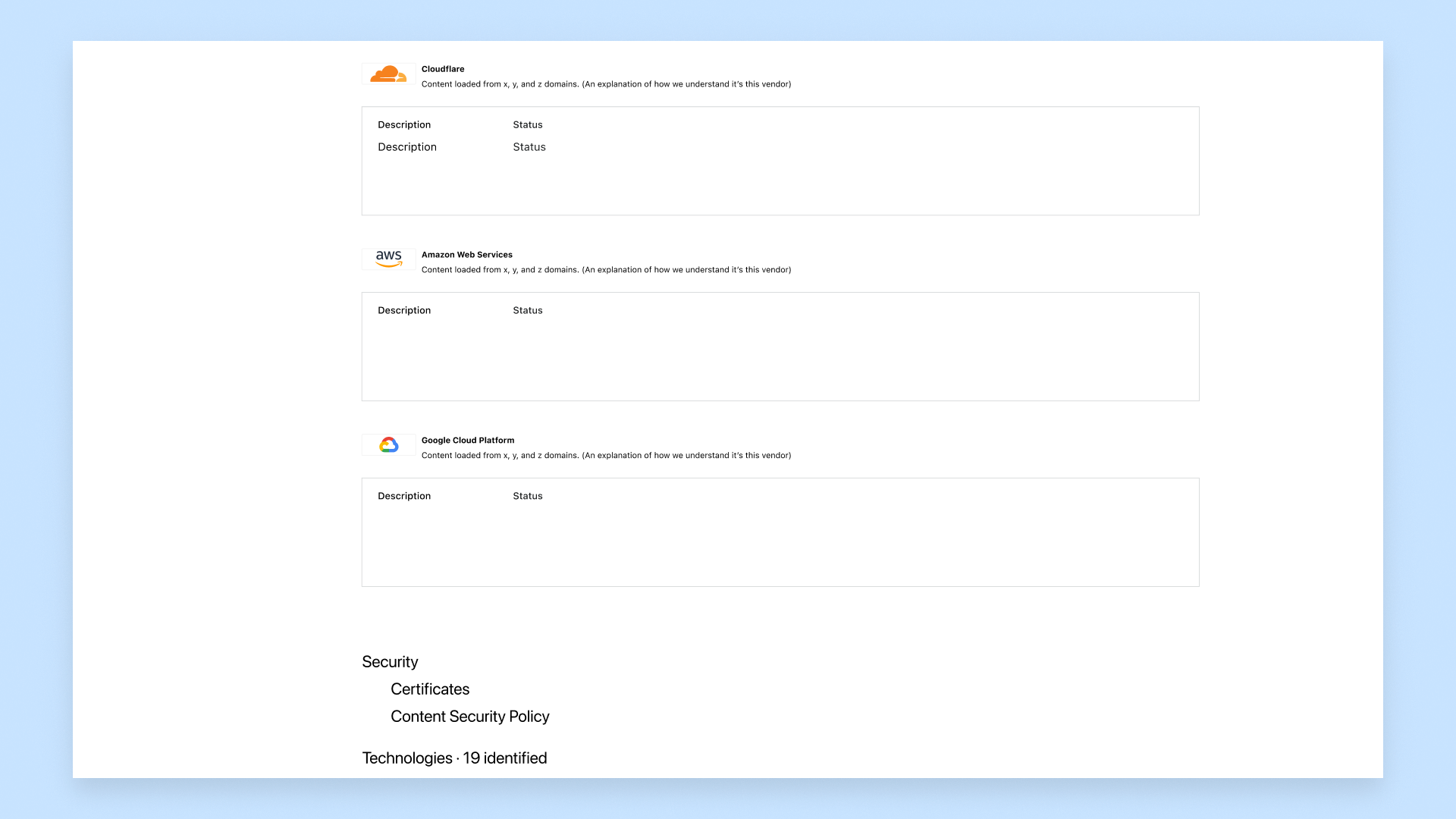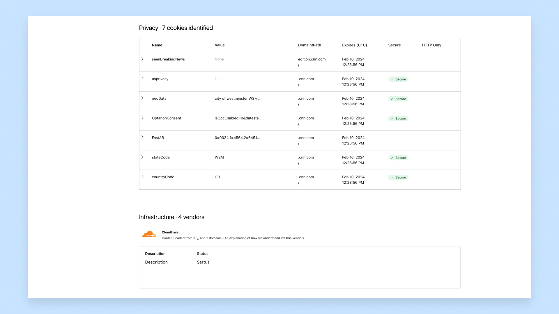 Once a scan has been successfully completed, a summary is presented including a screenshot of the scanned page, and individual cards for each group. From here, the user is able to click through to the dedicated sections to get further insights. It’s this style of organising and presenting information which resonates with myself the best — share an overview, and as the user has displayed intent to engage further with the app, present more detailed and contextual information along that journey.