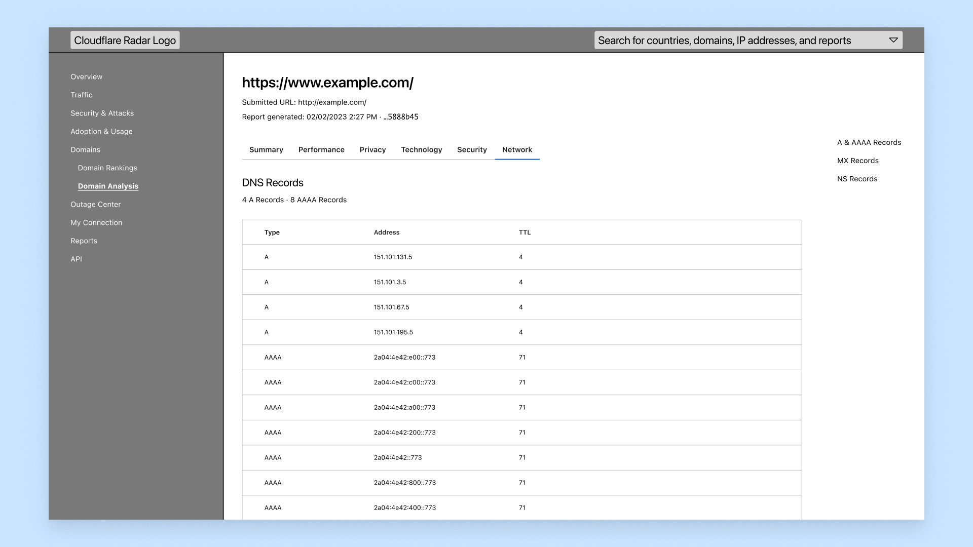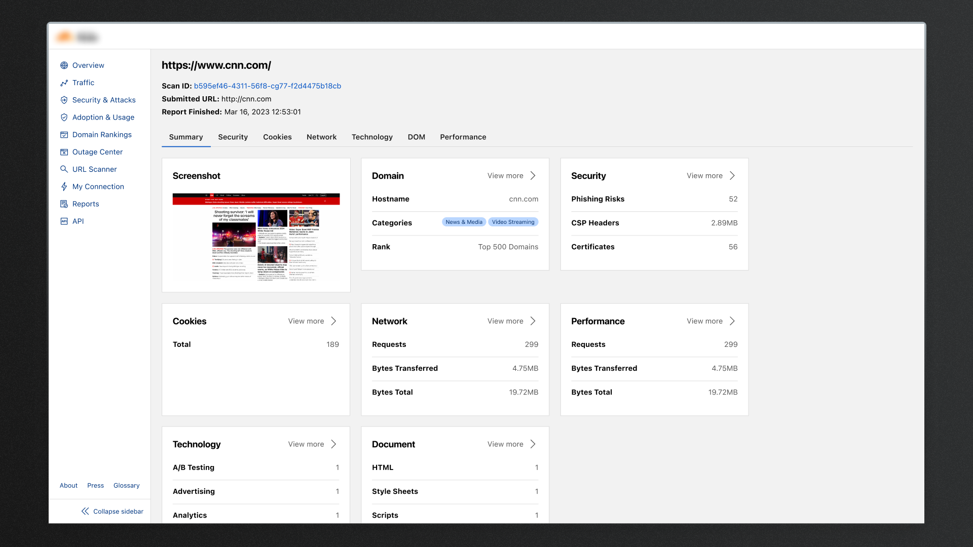 The Cloudflare Radar URL Scanner generates a report of a URL with a breadth of technical details such as page performance data, DNS records, and what libraries/technologies the page is using. It was released during Security Week in March of 2023.