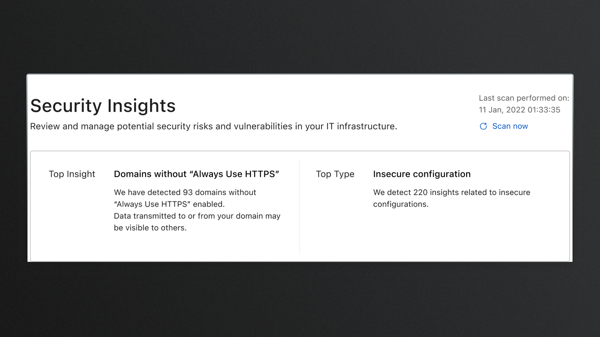 A single page summarising security vulnerabilities discovered across your infrastructure.